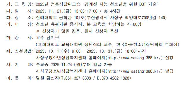 [안내][사상구청소년상담복지센터] 2025년 전문상담워크숍 홍보 및 신청 안내